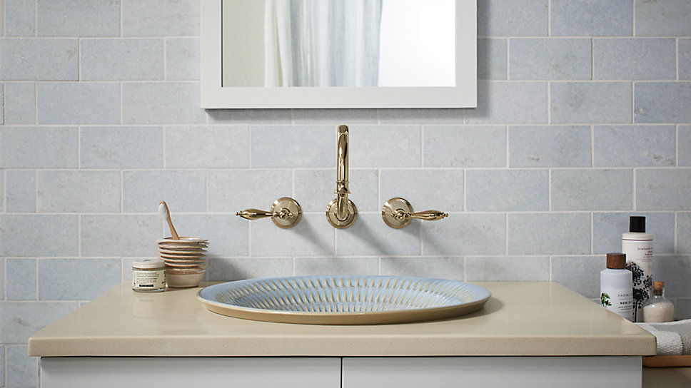 Vòi rửa treo tường Finial® mạ Vàng Pháp (Vibrant® French Gold) bổ sung cho giai điệu ấm áp của lớp men bằng Rutin Đá xanh của chậu rửa Derring ™.