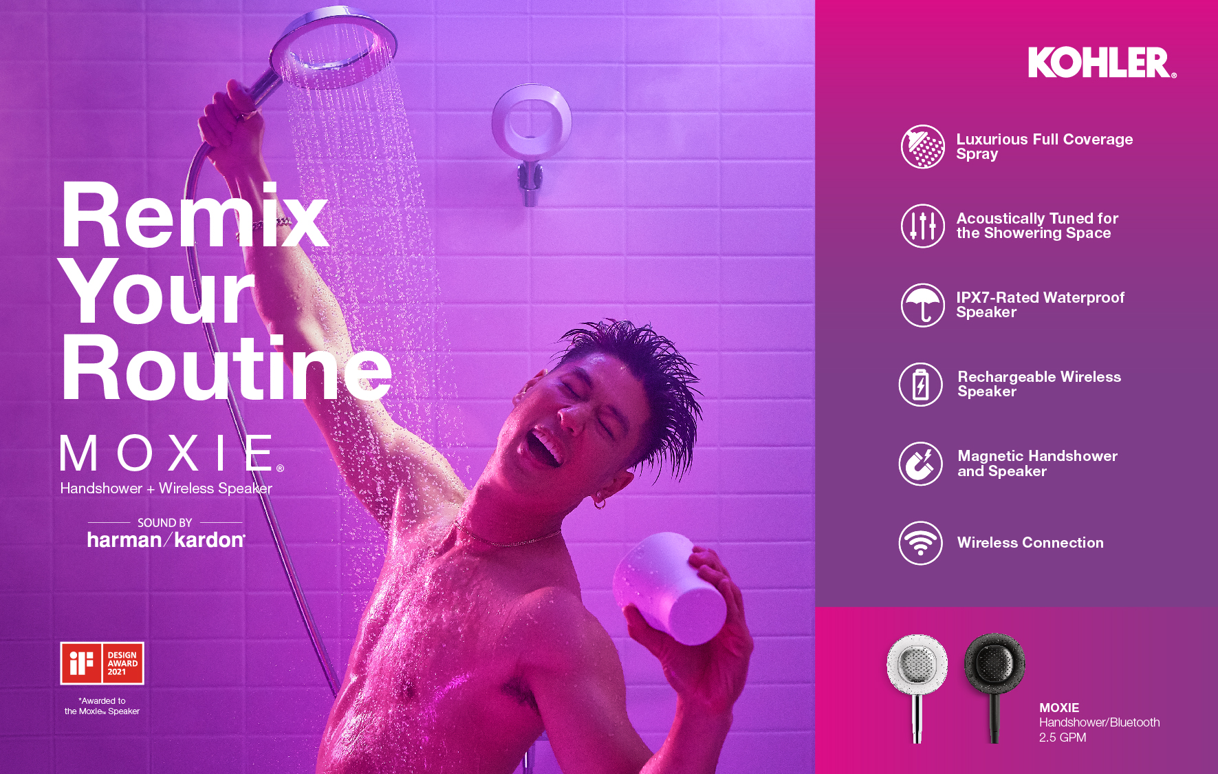 Kohler Co., a global leader in the design and manufacture of kitchen and bath products, launches Moxie Handshower + Wireless Speaker. The audio speaker in the shower, offers users the benefits of the company’s design excellence, modern styling and superior engineering along with unrivaled audio quality from the international esteemed speaker company - Harman Kardon. A new addition to Kohler’s Smart Home Portfolio, Moxie is designed to provide flawless hands-free performance with its Bluetooth model and the smart speaker featuring an embedded Amazon Alexa voice assistant. Moxie Handshower + Wireless Speaker is an inspired combination that elevates the mundane showering experience into something much more engaging and enjoyable.