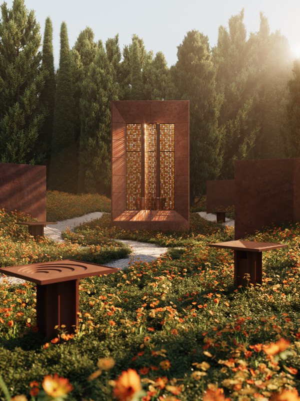 The tranquil showpiece draws its palette from weathered metals and elemental surfaces, as though it has emerged organically from its surroundings rather than being imposed upon them. Rising from a meadow of untamed wildflowers, the installation reflects a design philosophy rooted in reciprocity with nature.