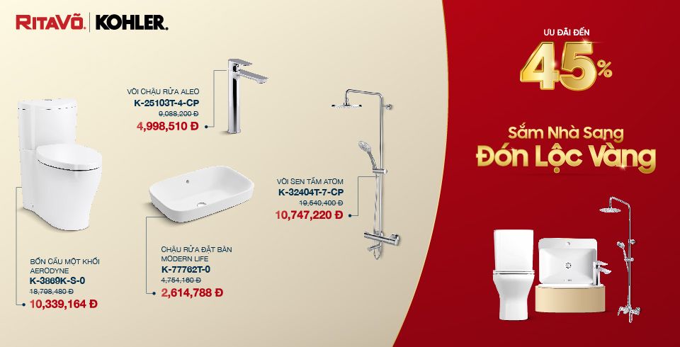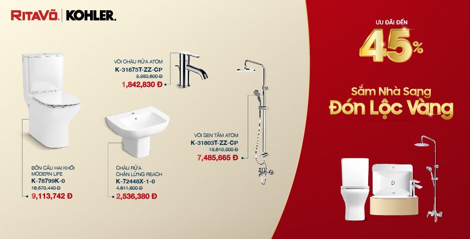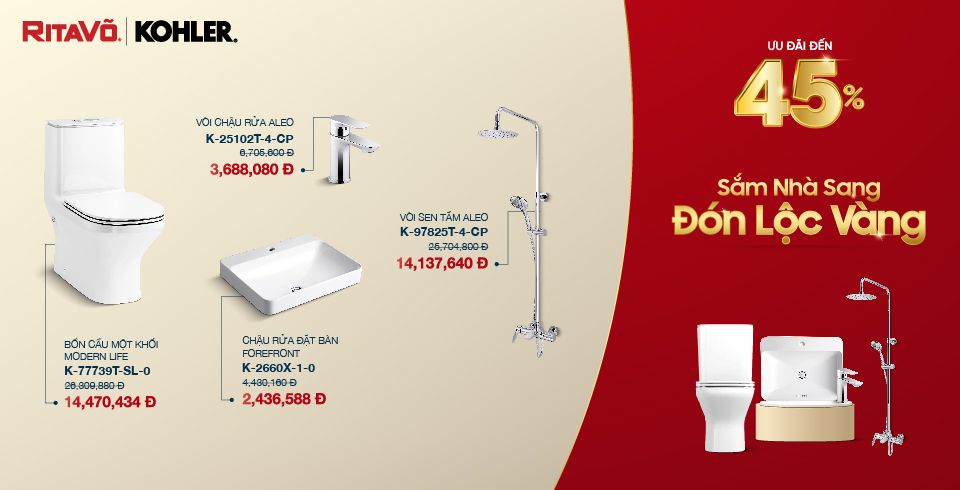 Phòng tắm giờ đây không chỉ là không gian vệ sinh mà còn là nơi thư giãn sau một ngày dài. Để trải nghiệm sự tiện nghi và nâng tầm cuộc sống, hãy nhanh tay đón lộc với ưu đãi lên đến 45% và trải nghiệm trọn bộ giải pháp vệ sinh cao cấp từ KOHLER.